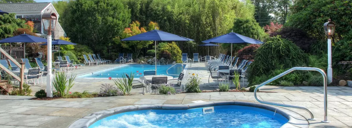 Gorgeous outdoor patio with large pool lined with chairs, bubbling hot tub and patio tables with blue umbrellas